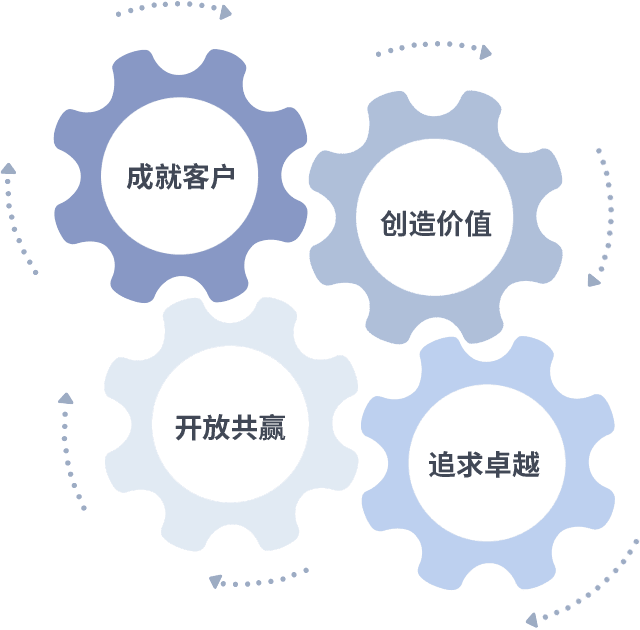 成就客户是一切决策的出发点,,,,创造价值是衡量所有工作的标准,,,追求卓越是我们做事做人的态度,,,,开放共赢是我们的格局也是最终的结果。。。。价值观的齿轮环环相扣,,,,推动着组织里的每个人不断向前。。